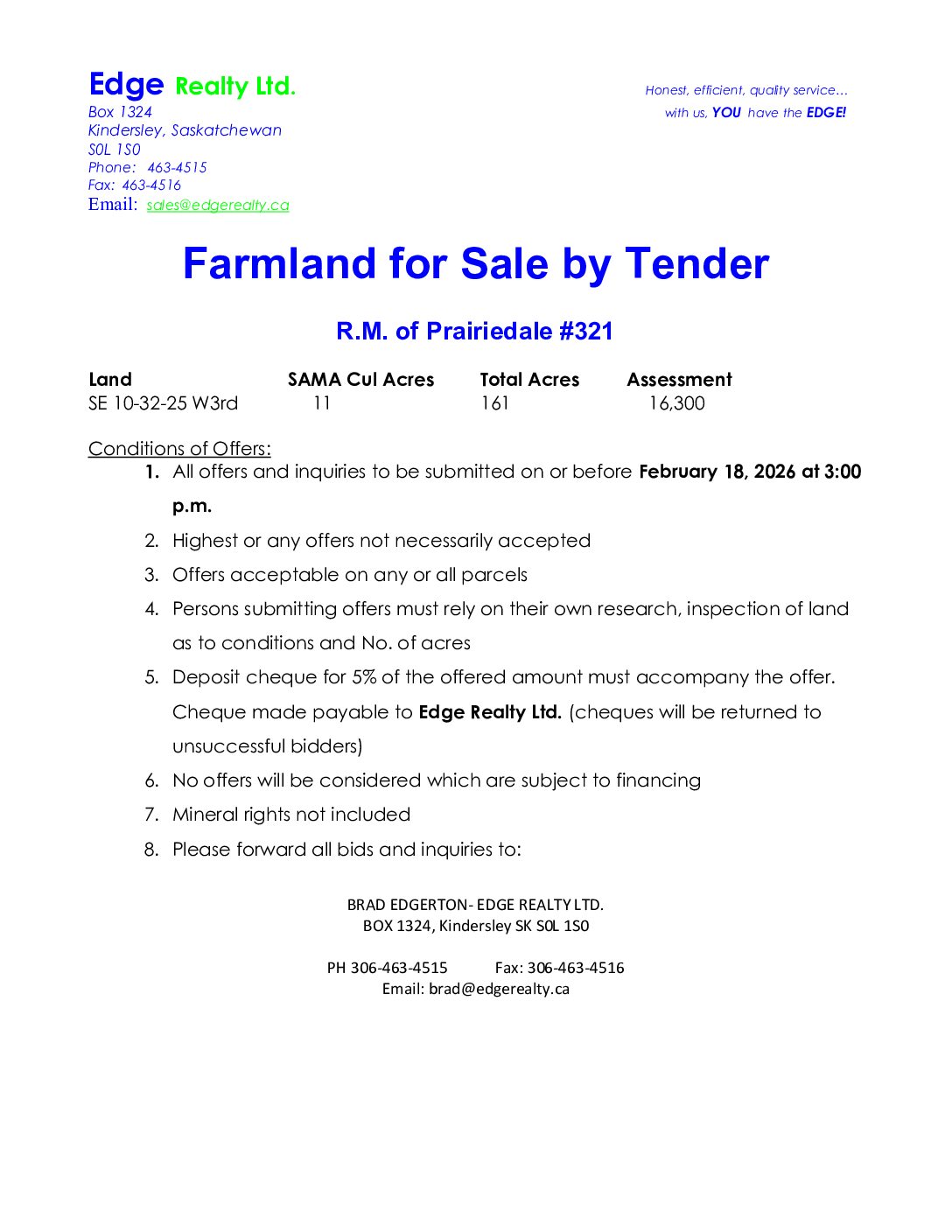 Farmland for Sale by Tender R.M. of Prairiedale #321 Land